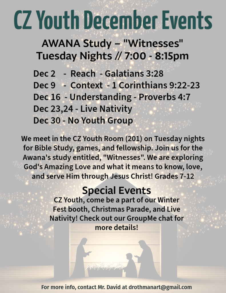 Club Zion Youth Group is a place where teens ages 12-19 meet to encourage one another, grow in their knowledge of God’s word and strengthen their faith in Jesus. We meet every Tuesday from 7:00 – 8:30 PM for worship, Bible study & fun. There’s never a dull moment with monthly events to look forward to throughout the year. Come hang with us!