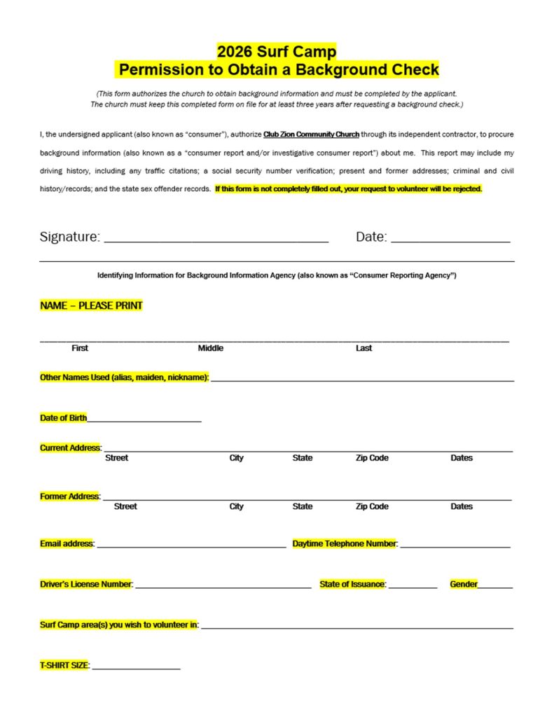 Surf Camp Volunteer Information and Background Check Form