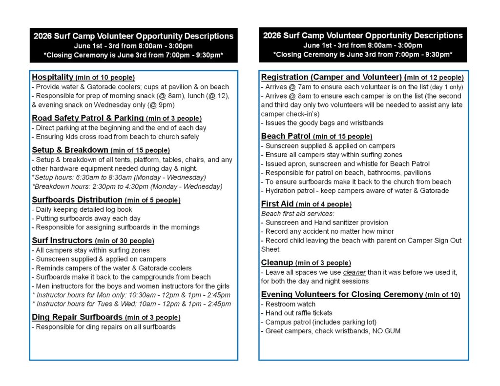 Life with Jesus is always full of new adventures. Surfing can be one of them. A board in the ocean can be a quiet place to hear God speak directly to you or it can be an opportunity to share your faith with others in the line-up. To celebrate Jesus in the beauty He created. Our idea for Surf Camp started when we realized that surfing and spirituality go hand-in-hand. God is everywhere, and there are so many lessons to be learned through surfing that apply to all areas of our lives. We decided to provide this opportunity for young people to come together and share the unprecedented thrill and joy of riding a wave in God’s glorious creation. Surf Camp has always been free to the community, and always will be. We consider this an important ministry that has the power to introduce young people to Jesus and bring them to repentance and salvation. Surf Camp wouldn’t be what it is without you – our community. Thank you, each and every one of you – from volunteers, to donors, to campers – for everything you do to make Surf Camp a success year after year after year, for almost 27 years in a row now. We cannot take any credit because the truth is, all the glory goes to God. It is thanks to His loving attentiveness that Surf Camp is even able to happen.